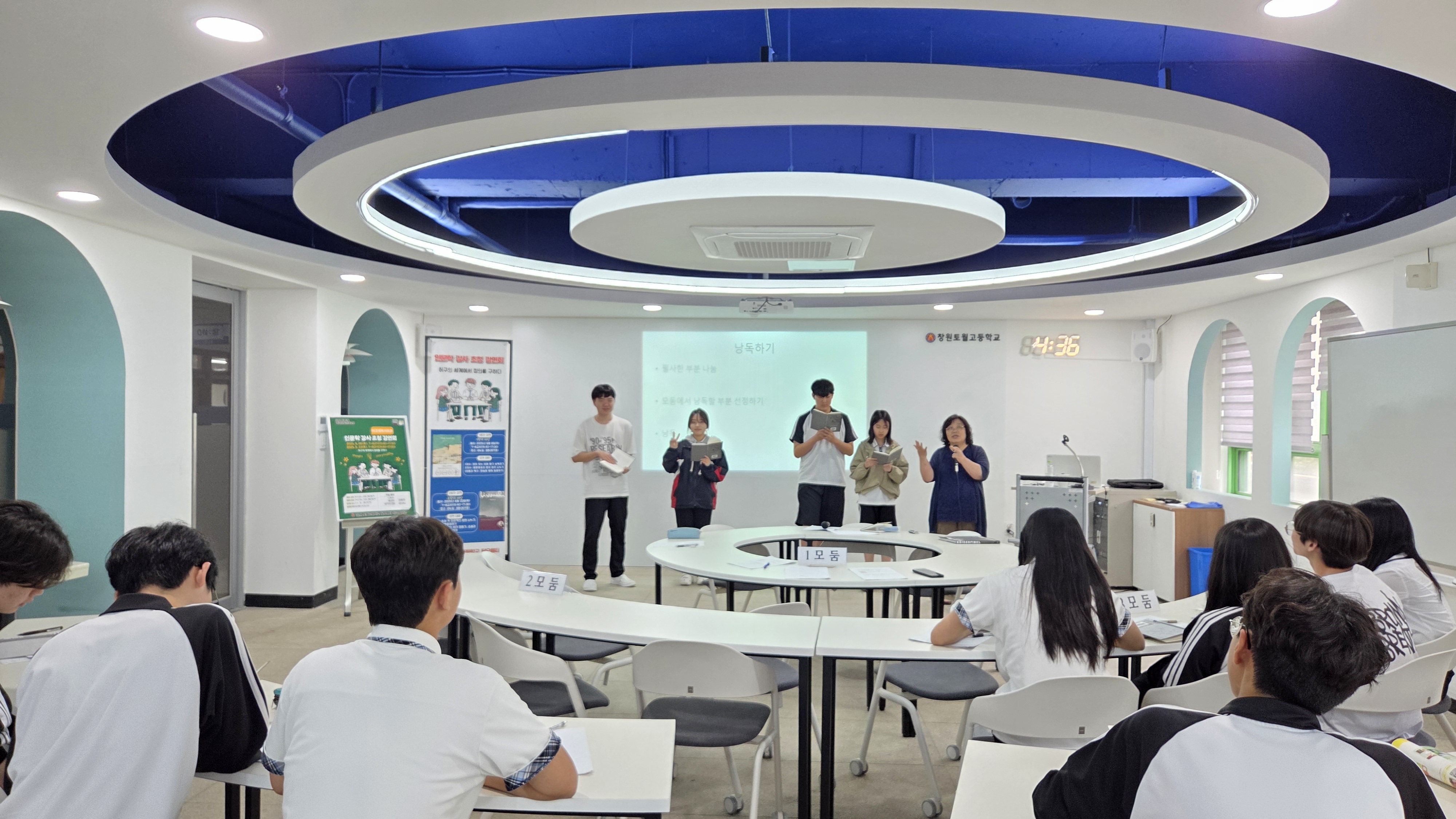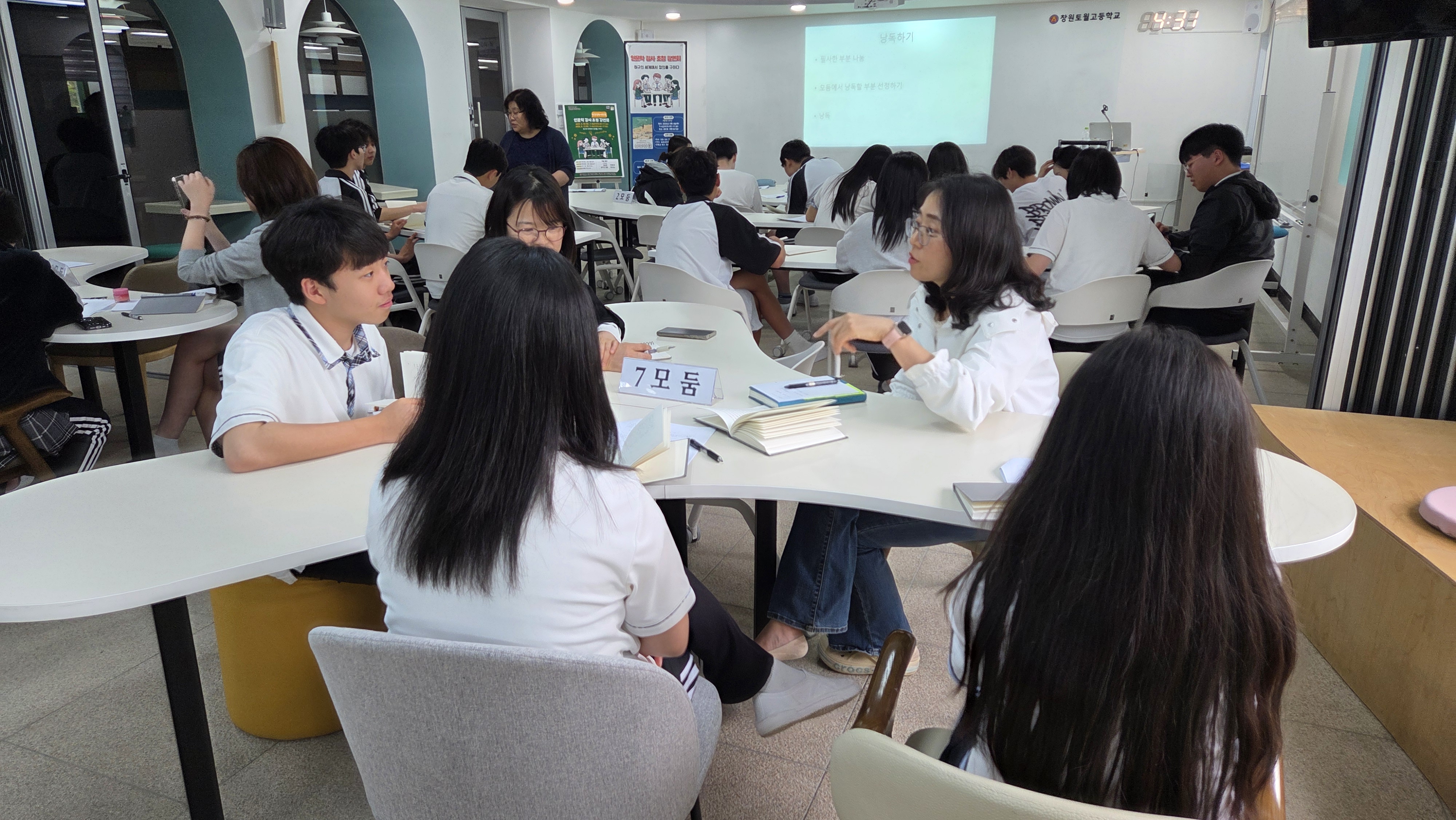 창원토월고등학교(교장 오현숙)는 5월 8일(목), 교내도서관에서 1학년 학생 30여명을 대상으로 ‘2025년 인문학 강사 초청 강연회’ 및 비경쟁독서토론회를 개최하였다.