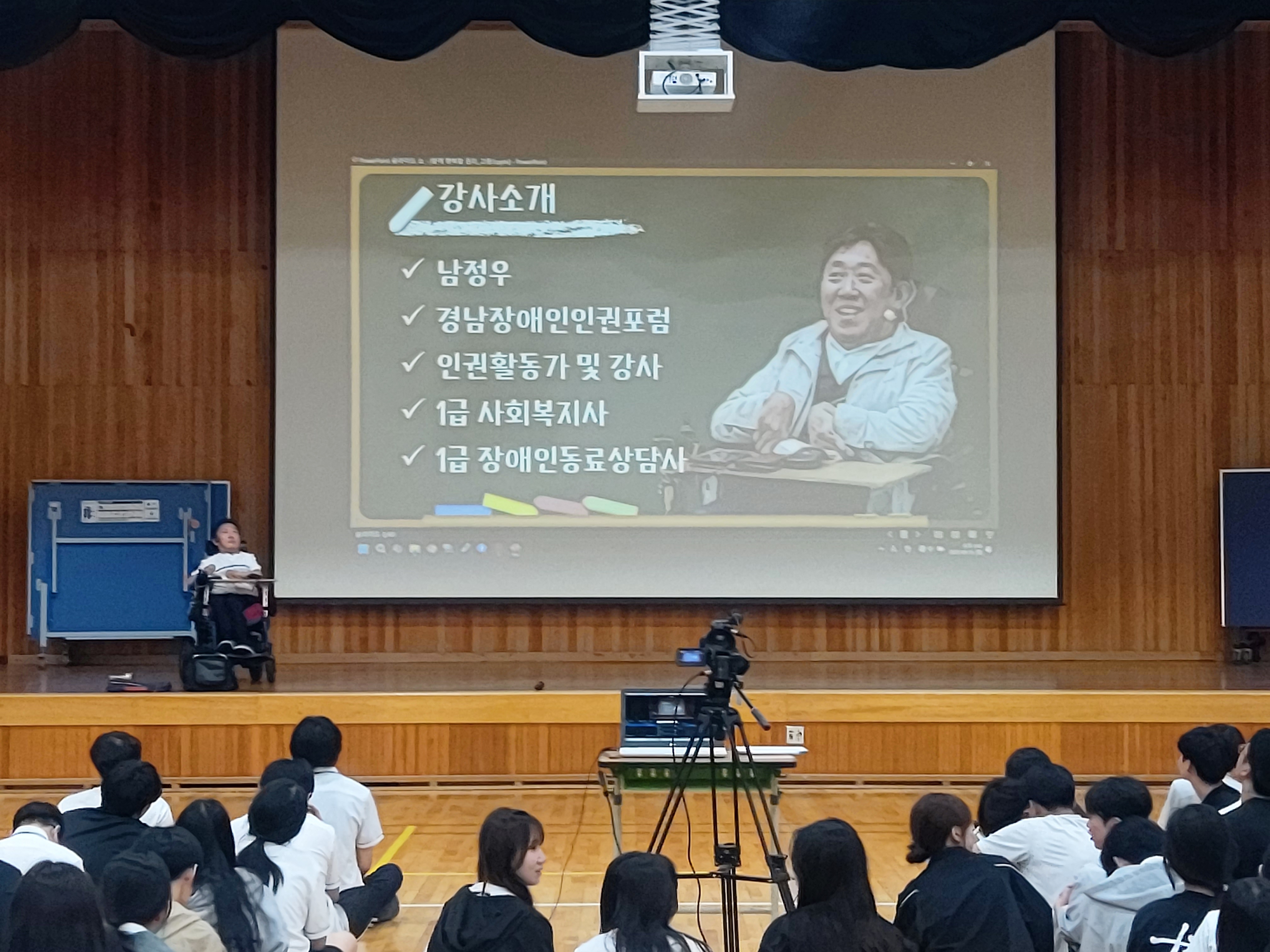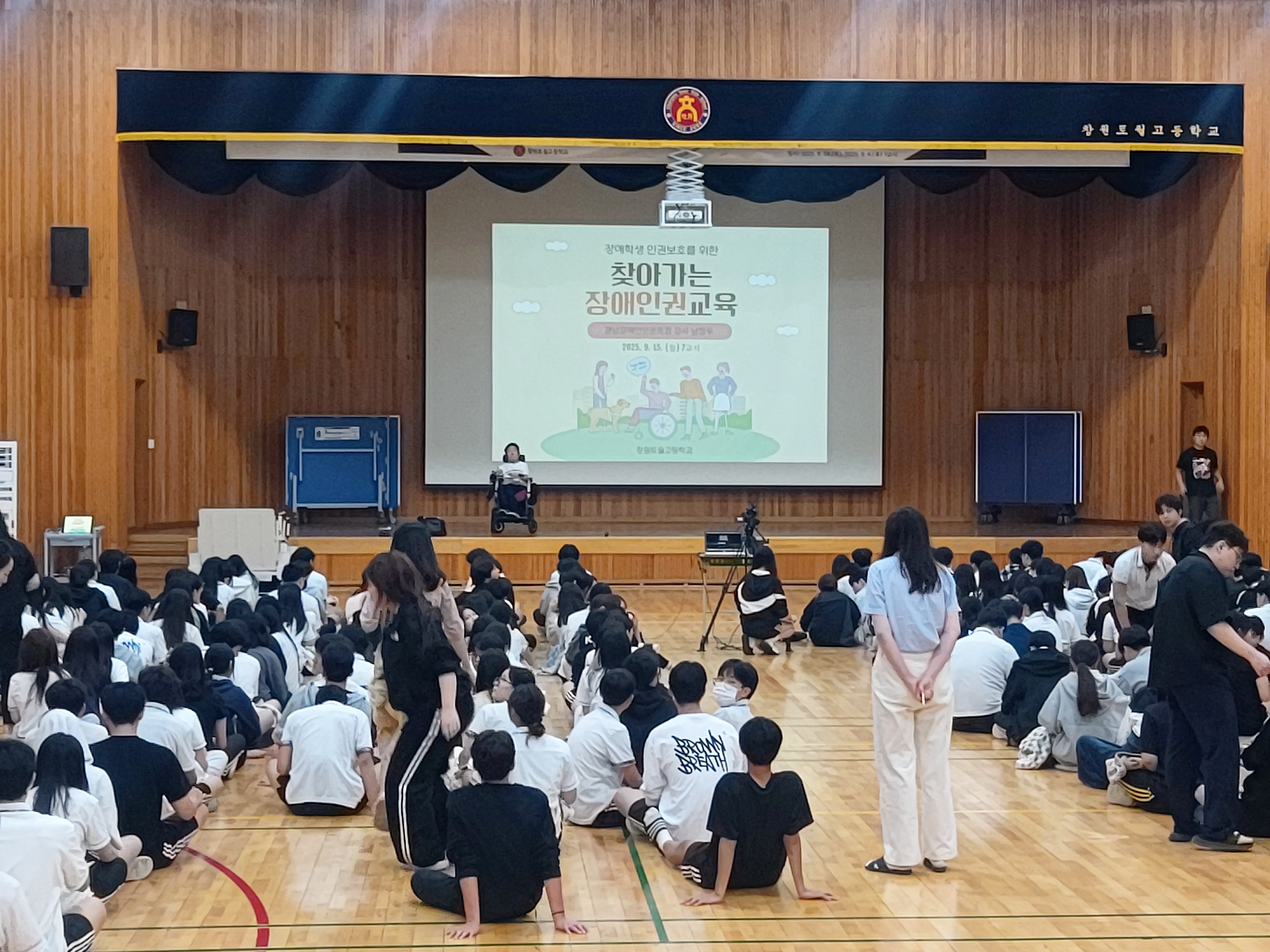 창원토월고, 장애는‘틀림’이 아니라‘다름’임을 배우다! - 장애학생 인권보호를 위한‘찾아가는 장애인권교육’ 실시 - 장애인 인식개선과 인권침해 예방 교육에 함께 뜻 모아 - 장애학생과 함께하는 포용적인 학교문화 조성 계기 마련 창원토월고등학교(교장 오현숙)는 9월 15일(월) 7교시 전교생을 대상으로 장애학생 인권보호를 위한 ‘찾아가는 장애인권교육’을 실시하였다. 이번 교육은 학생들이 장애에 대한 올바른 인식을 갖고, 편견과 차별 없는 학교 문화를 만들어 가기 위해 마련되었다. 특히, 장애를 가진 강사를 초빙하여 장애인에 대한 이해와 인권 존중의 중요성을 알리고 장애학생들이 안전하고 존중받는 환경을 조성하는데 목적이 있었다. 강사는 장애를 가진 본인의 경험과 장애 인권에 대한 깊이 있는 강의를 통해 장애인에 대한 편견과 차별이 얼마나 심각한 문제인지 설명하였으며, 모두가 평등하게 대우받아야 할 권리가 있다는 메시지를 전달하였다. 학생들은 적극적인 참여와 질문을 통해 장애 인권에 대한 이해를 높였으며, 장애학생과 함께하는 포용적인 학교문화 조성의 필요성을 다시 한번 인식하는 계기가 되었다. 교육에 참여한 한 학생은 “장애가 ‘틀림’이 아닌‘다름’이라는 것을 마음으로 이해하게 되었다”며“오늘 배운 내용을 잊지 않고 학교생활 속에서 장애를 가진 친구들과 스스럼없이 어울리고 먼저 다가가는 친구가 되고 싶다”고 소감을 밝혔다. 이번 행사를 기획한 진●● 특수교사는 “이번 교육을 통해 학생들이 장애인 인권에 대한 인식을 새롭게 하고, 차별 없는 학교 환경을 만들어 가는데 큰 도움이 되기를 기대한다”라고 말했다. 창원토월고는 앞으로도 정기적인 장애이해교육 및 관련 캠페인을 통해 학생들이 더불어 사는 사회의 건강한 구성원으로 자라날 수 있도록 지원할 계획이다. 끝.